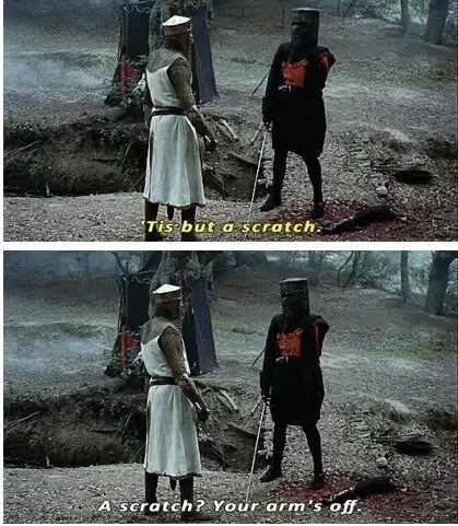 King Arthur has just met the Black Knight on his journey to Camelot, where he is seeking brave knights to join him at the round table. Arthur needs to cross a small bridge, which the Black Knight is guarding and refuses to let him pass. The battle begins, and Arthur quickly removes the Knight’s left arm. Seemingly unfazed by the encounter, the Black Knight ignores his wound and continues on with the duel, brushing it off as “but a scratch”.